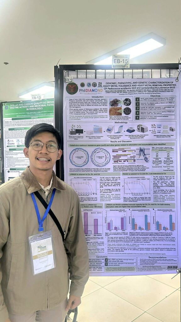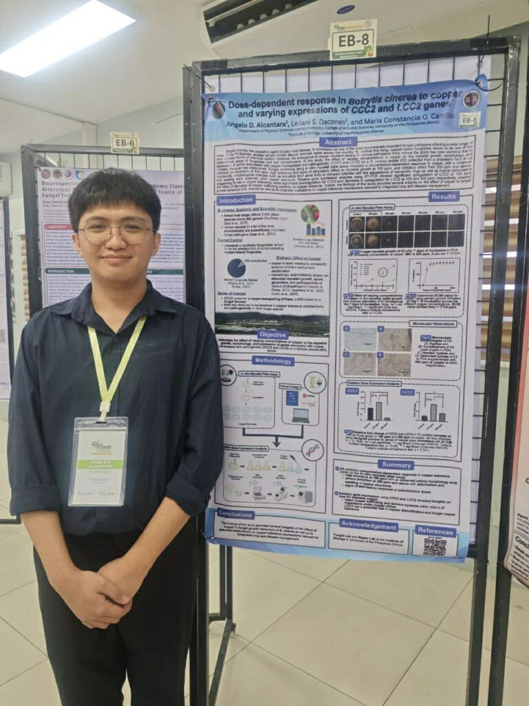 Mr. Sean Carlo Palomares (batch 2025) and Mr. Angelo Alcantara (batch 2024) won the Best Poster-Citation Award (Environment and Biodiversity category) for their studies: “Dose-dependent response in Botrytis cinerea to copper and varying expressions of CCC2 and LCC2 genes” and “Genomic, phenotypic and genetic characterization of heavy metal tolerance and heavy metal removal properties of Pediococcus acidilactici 3G3 and Lactiplantibacillus plantarum BS25”, respectively.